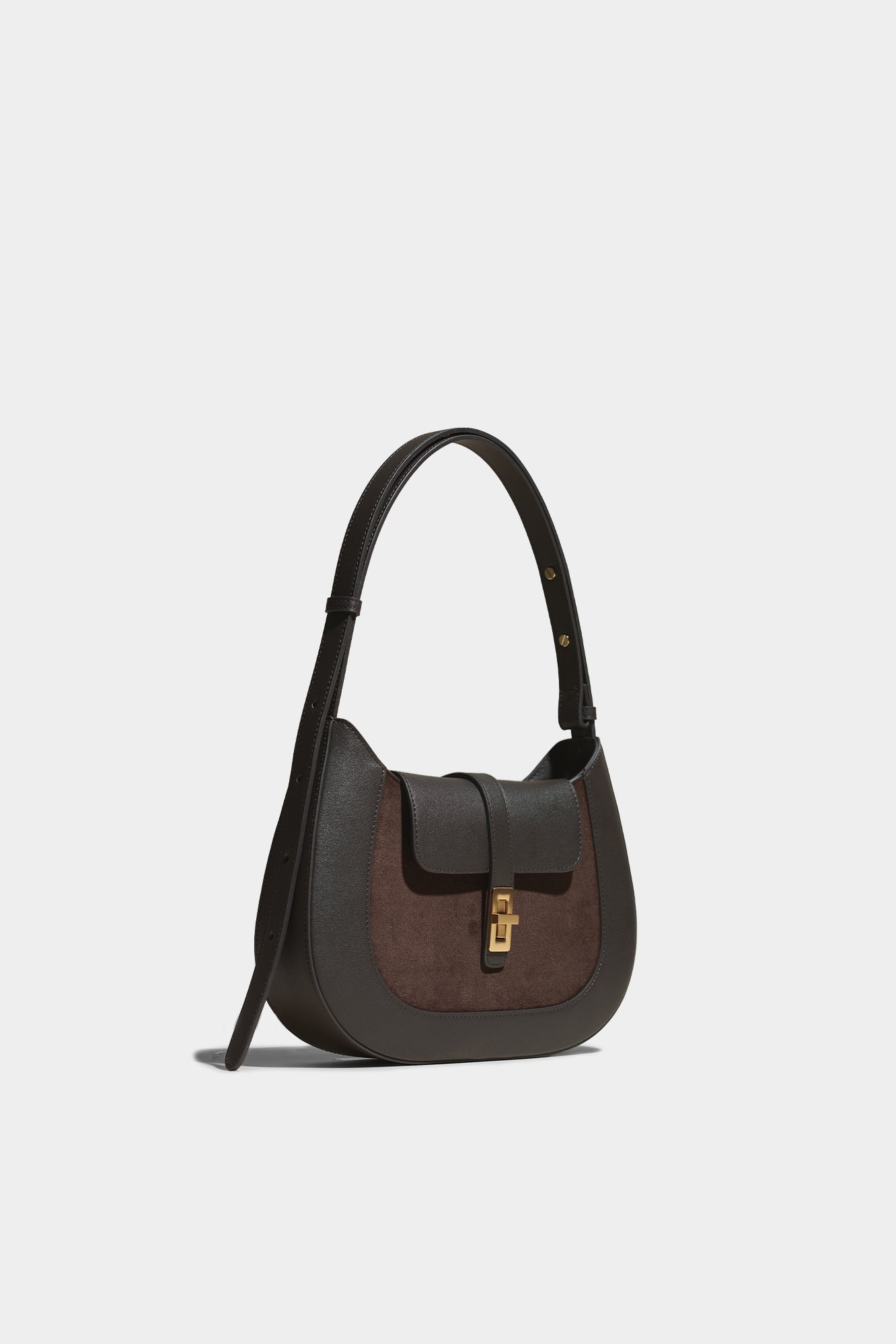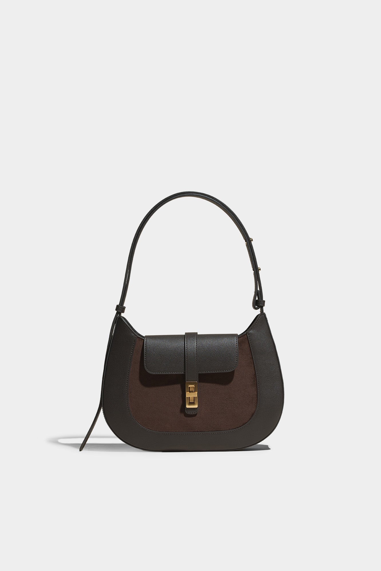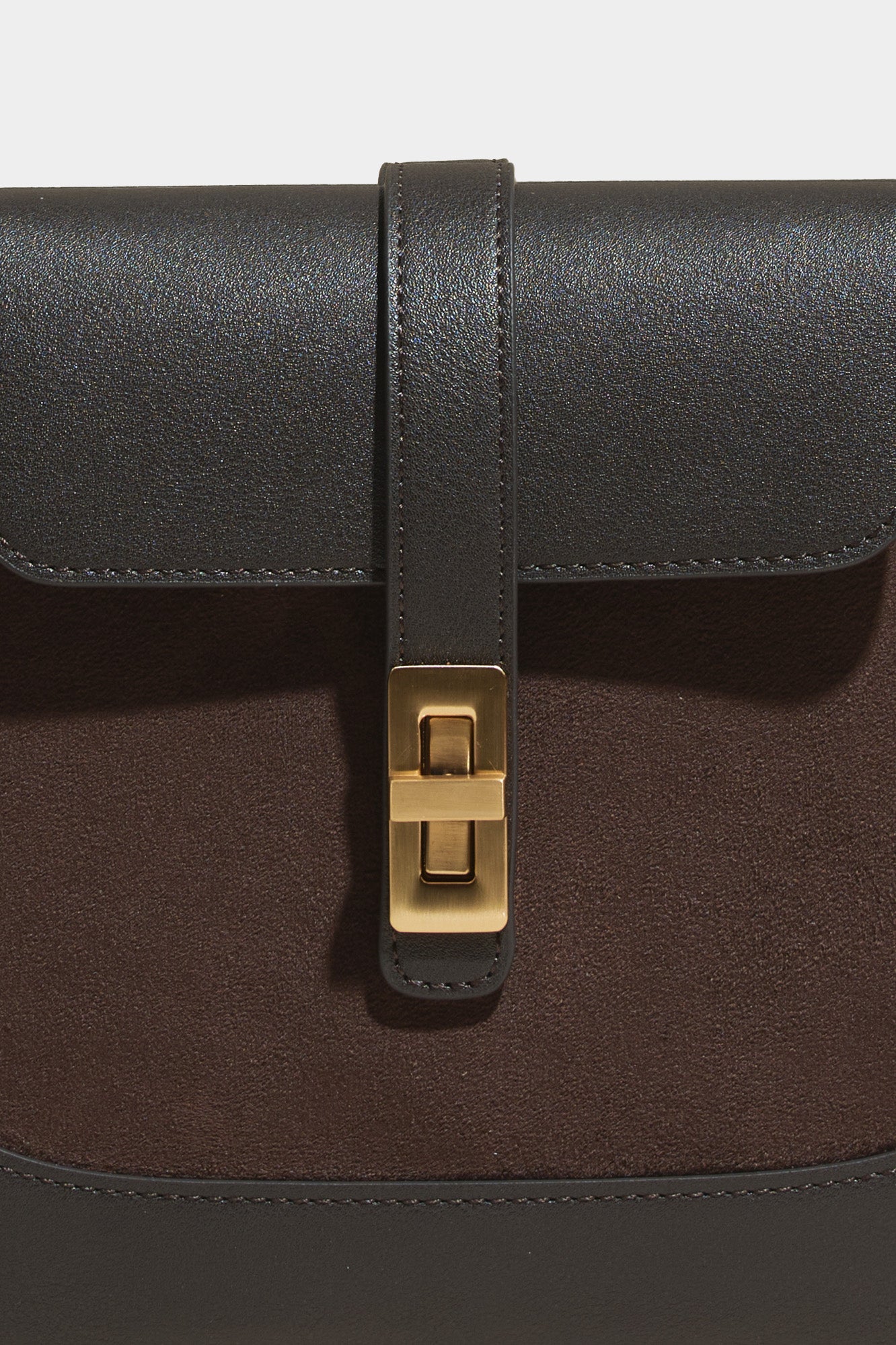 The deep walnut shade of the suede stands out in this unique combination of two materials.