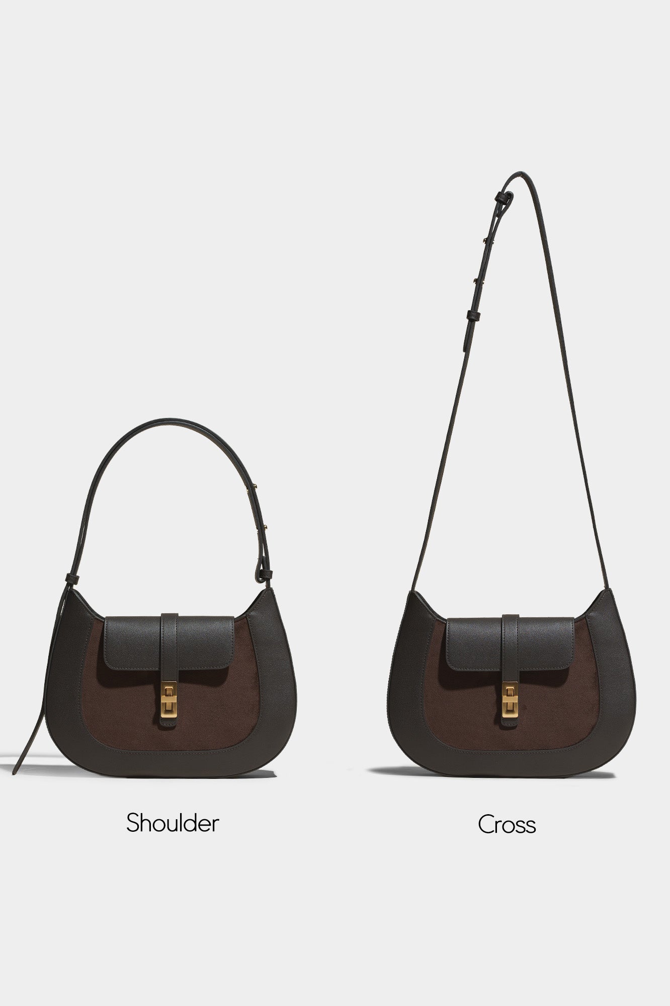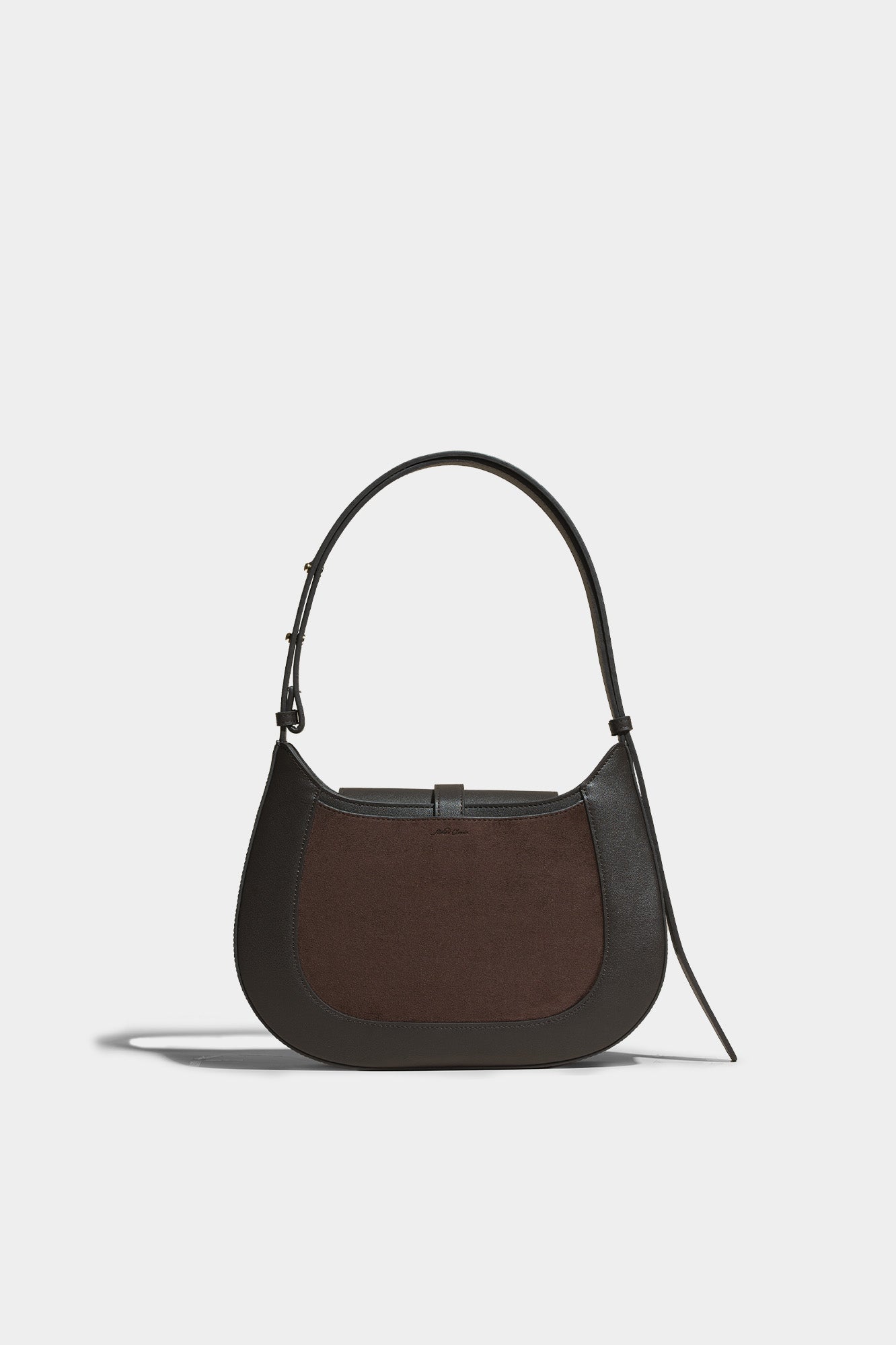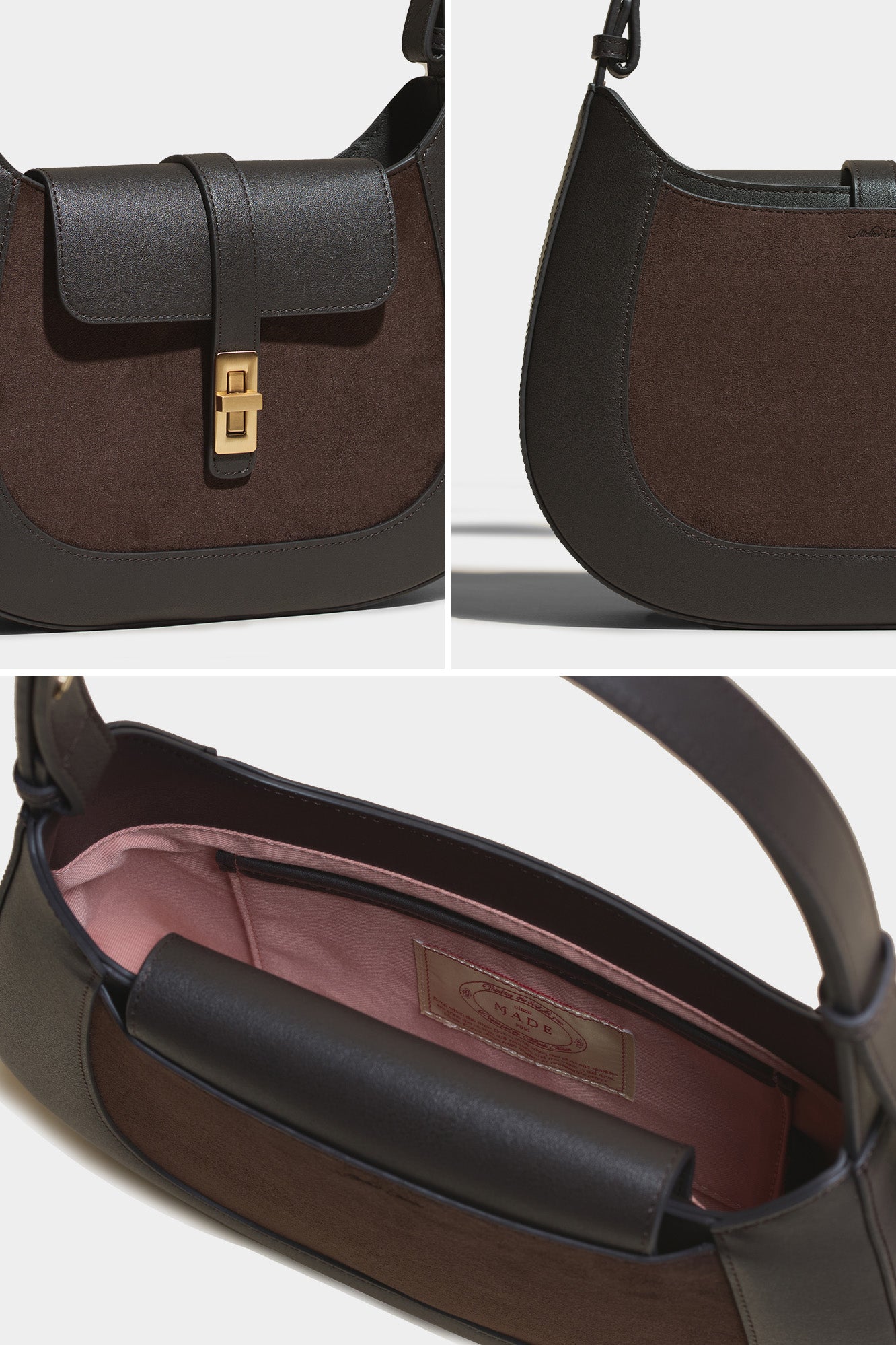 The deep walnut shade of the suede stands out in this unique combination of two materials.